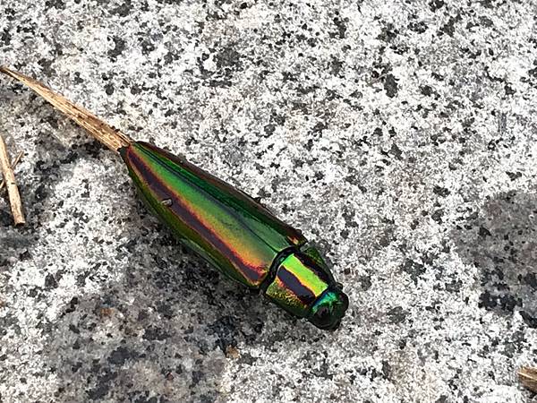 #蟲蟲好朋友 除了上次看到的大青叩頭蟲以外,野蔓園也有其他鞘翅目、閃爍金屬光澤的蟲蟲好朋友。例如這隻不小心溺斃在儲水桶裡的彩虹吉丁蟲,背上的紫紅條紋與青銅色光芒,形成美麗的組合。